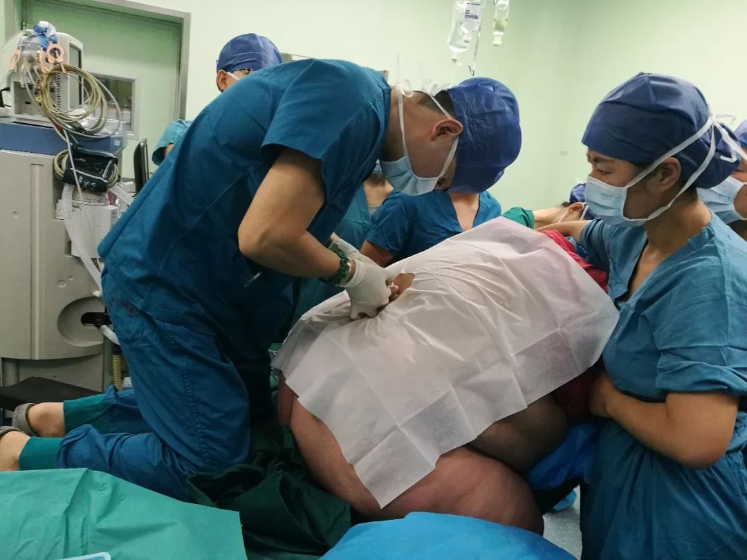 9月30日上午患者入室后因常规无创血压袖带无法测量血压,先对产妇行桡动脉穿刺持续监测动脉压,此时患者血压高达251/120mmHg,心律 115-125 bpm。由于患者实在太胖,常规的侧卧位很难完成操作,在产科及手术室多名医护人员帮助下艰难地协助产妇坐在手术床上。在崔晓岗主任指导下,陈海燕主治医师超声下精确完成椎间隙定位,医生党江坤主治医师就跪在床上成功进行了硬膜外穿刺。在满意的硬膜外麻醉下,郭静和成键两位主任顺利完成了剖宫产手术。手术2小时结束,顺利取出健康的男婴,术后安返病房。目前母子平安,不久将出院。