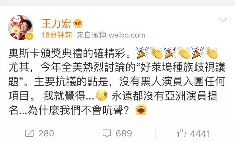 “奧斯卡頒獎典禮的確精彩。尤其,今年全美熱烈討論的“好萊塢種族歧視議題”。主要抗議的點是,沒有黑人演員入圍任何項目。我就覺得...[黑線] 永遠都沒有亞洲演員提名...為什麼我們不會吭聲?”王力宏问。