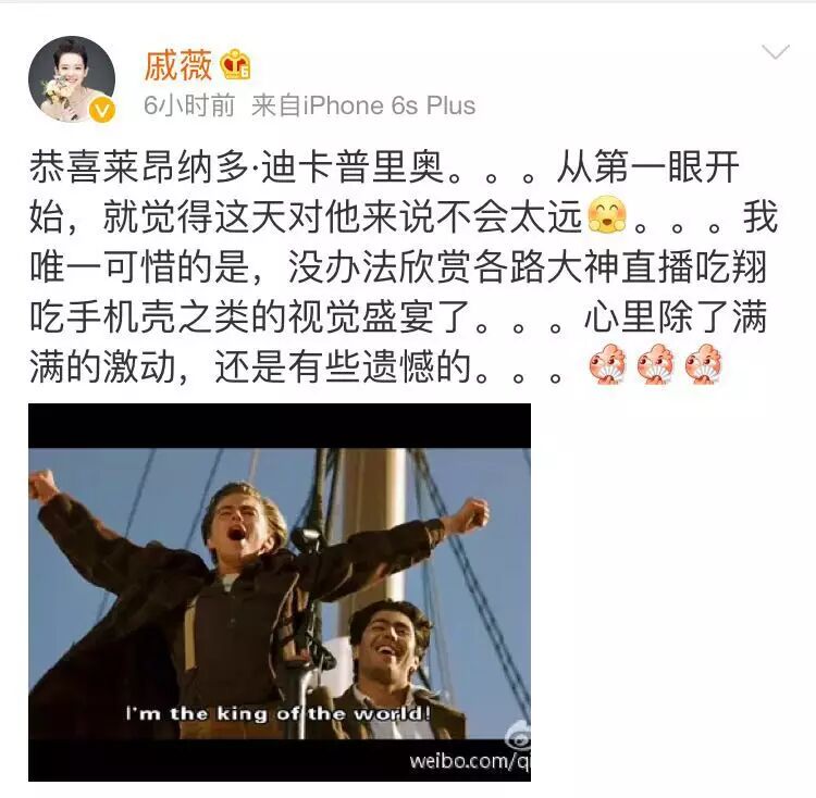 戚薇甚至激动到假想吃翔的场景: “恭喜莱昂纳多·迪卡普里奥。。。从第一眼开始,就觉得这天对他来说不会太远[太开心]。。。我唯一可惜的是,没办法欣赏各路大神直播吃翔吃手机壳之类的视觉盛宴了。。。心里除了满满的激动,还是有些遗憾的。。。”