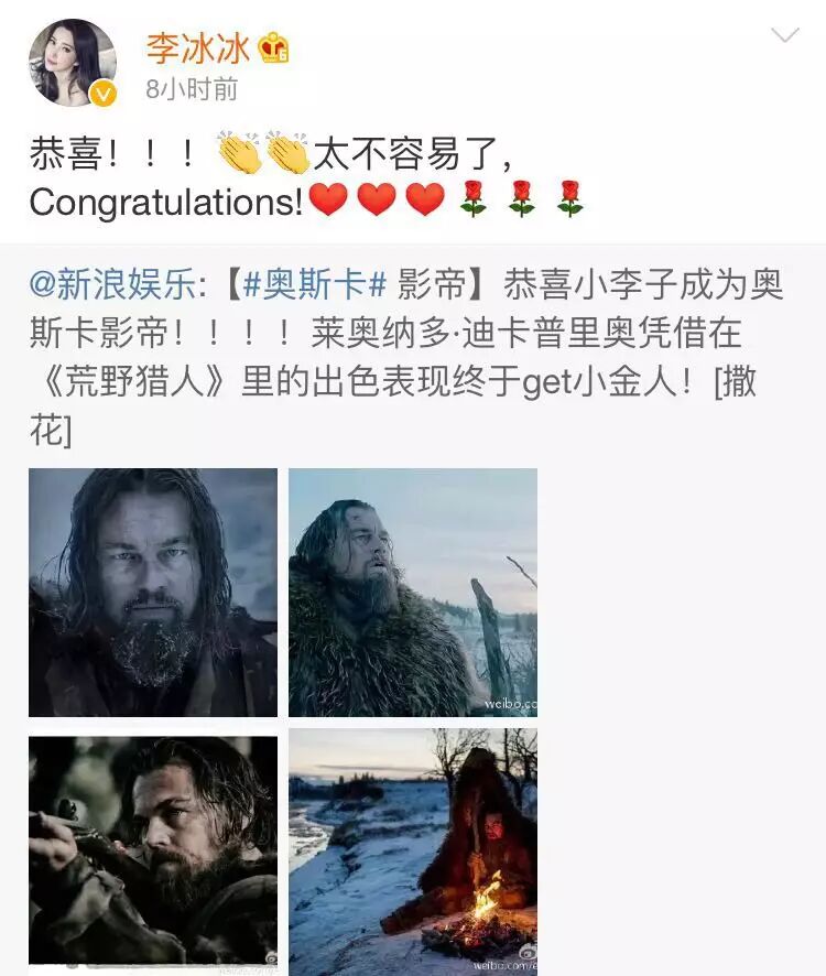 国内的明星大腕儿们都纷纷通过微博等形式表示祝贺,早在26号,章子怡就特地写了一篇长文预测了小李子能获奖:“不出意外,今年奥斯卡定是小李的主场。”“想必评委脑中真的会闪现小李哭晕在厕所的“情景”。(至少我会,画面太惨我~不不不要)”章子怡写道。