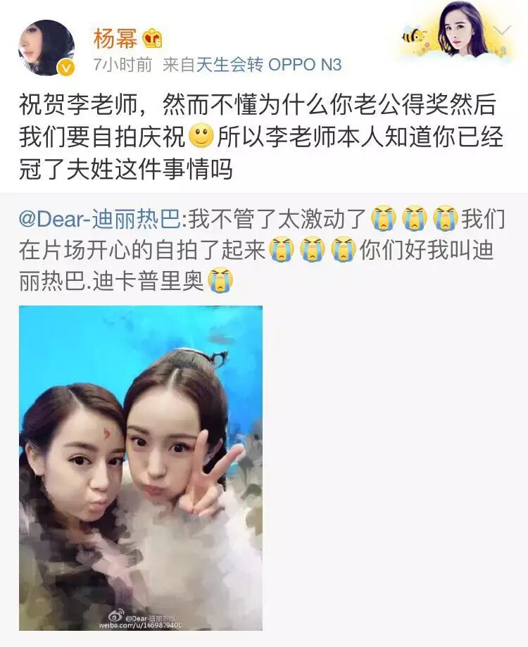“祝贺李老师,然而不懂为什么你老公得奖然后我们要自拍庆祝[微笑]所以李老师本人知道你已经冠了夫姓这件事情吗”随后杨幂转发此条微博调侃道。