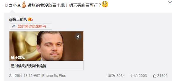 而在公布小李子获得小金人的消息后,章子怡情绪激动的转发了此条微博:“恭喜小李,紧张的我没敢看电视!明天买彩票可行?”不得不说,章子怡神机妙算,预测的果然是够准的。