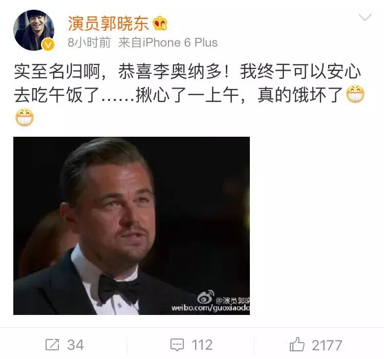 郭晓东为了帮小李子看着小金人不被别人抢走,紧张的午饭都没吃:“实至名归啊,恭喜李奥纳多!我终于可以安心去吃午饭了……揪心了一上午,真的饿坏了[嘻嘻][嘻嘻]”