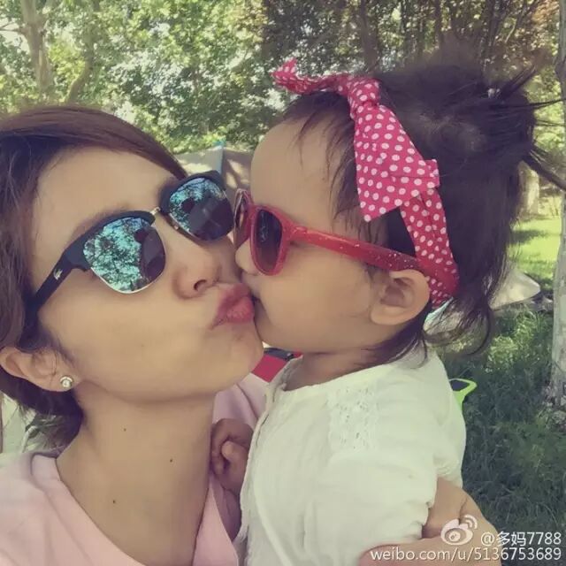 5月11日晚,黄磊老婆孙莉通过微博晒和小女儿多妹温馨照,照片中,孙莉戴着太阳镜,将女儿抱在怀里,多妹头上扎着粉色斑点蝴蝶结发箍,和妈妈嘟嘴亲吻,画面十分温馨幸福。