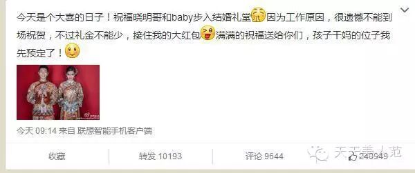 虽然人没有到现场,但范冰冰说了,份子钱一分也不少。另外,还提前预定了干妈位置,总而言之,冰冰很OK。晓明都大婚了,衷心希望冰冰和李晨早日喜结良缘。