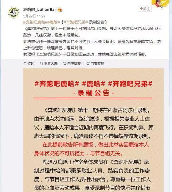 凤凰娱乐5月30日讯,鹿晗官方微信公众号曝出鹿晗退出《跑男》第11期在内蒙古阿尔山的录制。浙江卫视方面也向记者确认了此消息,至于退出的原因,浙江卫视表示不想鹿晗去阿尔山这一期,我们也是心疼鹿晗同学。”网友表示:这个原因说出来挺有意思。据网友曝料,鹿晗近日的身体无恙,而且还晒出了其近日游泳的照片。至于《奔跑吧兄弟》第十一期于5月29日在阿尔山录制。由于地点偏远,根据相关专业人士建议,鹿晗本人不适合近期内再度飞行,所以几经权衡,退出第11期的录制的说法并不准确。