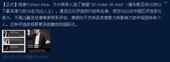 很荣幸,因为雷锋网在智能硬件行业垂直媒体方向的努力,我入选了福布斯所选十个领域中的传媒与营销榜单。