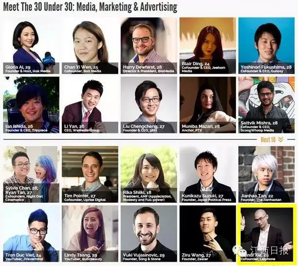 日前,美国财经杂志《福布斯》公布了首届“30 Under 30 Asia”榜单(亚洲30岁以下30人)。有36名中国创业者入围总的300人榜单,华人总数占据了该榜单的五分之一,包括中国演员AngelaBaby、歌手邓紫棋、游泳男神宁泽涛、丁俊晖等。
