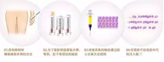 自体脂肪是个好东西,哪里需要填哪里~主要是抽取腹部和大腿根部等脂肪丰富处的适量脂肪,然后纯化、处理、移植到眼底处,达到营造卧蚕的目的。