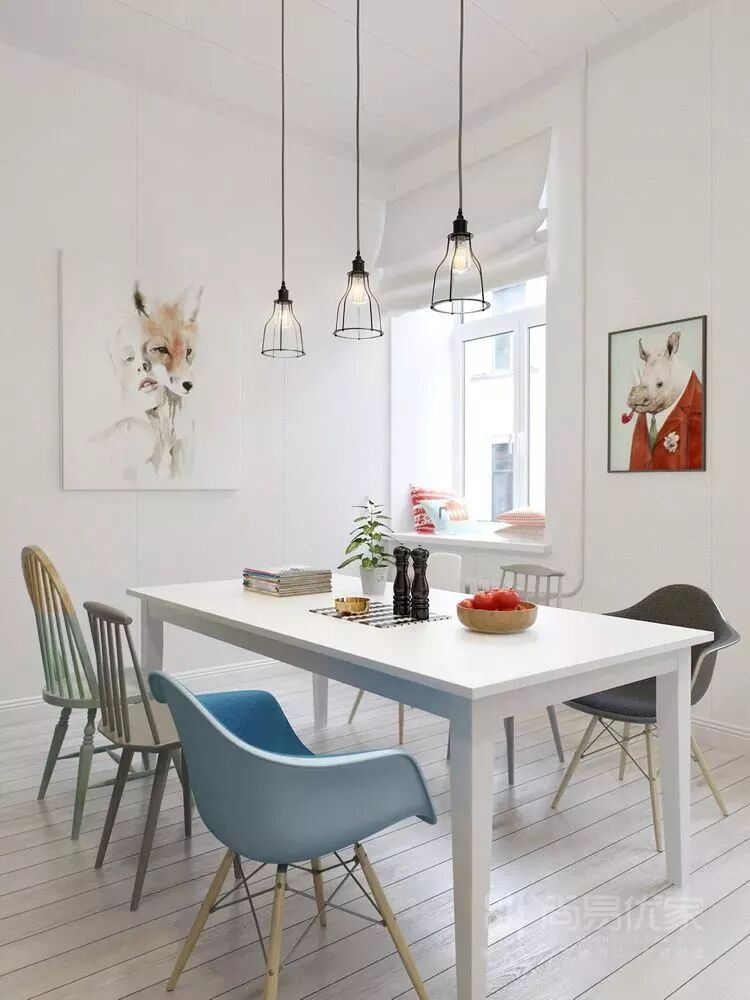 挂画时尚而大胆,充满野性的魅力,表达出对自由的渴望、对自我的珍视与关注,抓人眼球。淡蓝色的餐椅线条感十足,充满时尚的张力,红色的巧妙点缀,消抵了空间冰冷质感,让空间更有温度。
