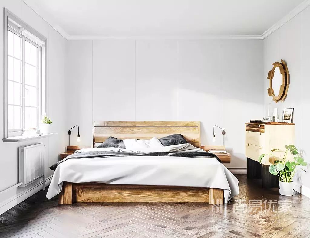 浅白色的墙面,让空间有了冰玉的质感。一盆绿植,让空间春意盎然,焕发无限生机。浅黄色的实木大床,巧妙地提升了空间的温度,质朴温润中散发着沁入心脾的木香。