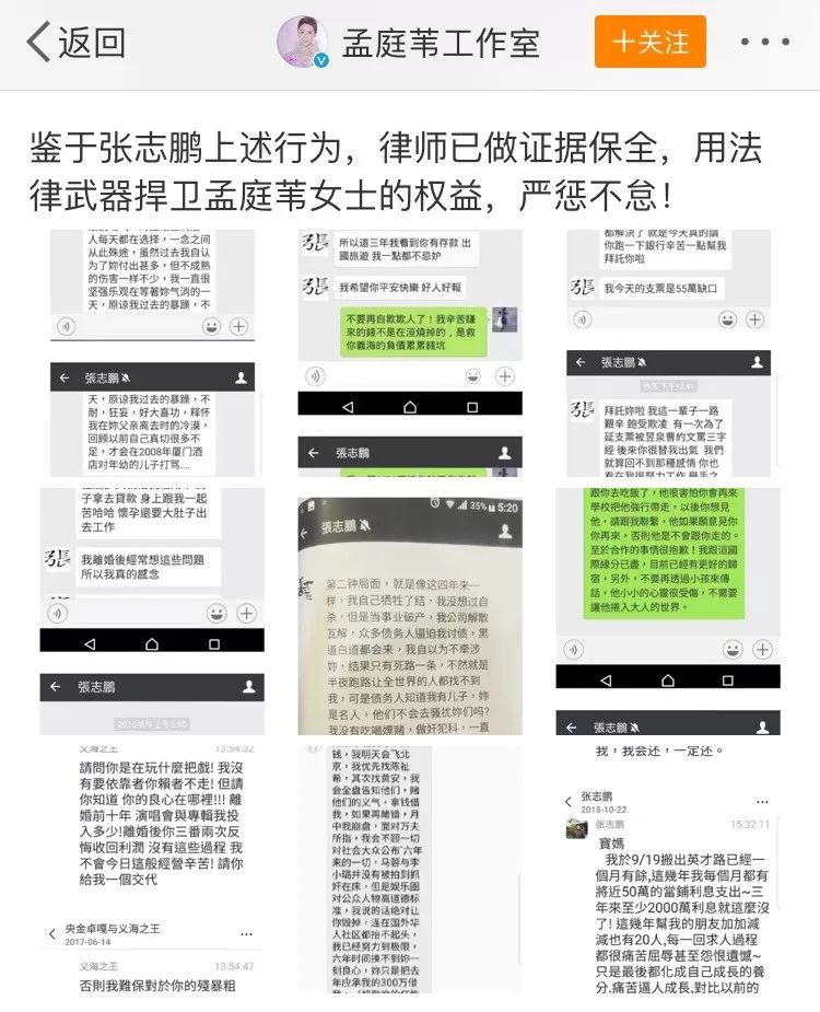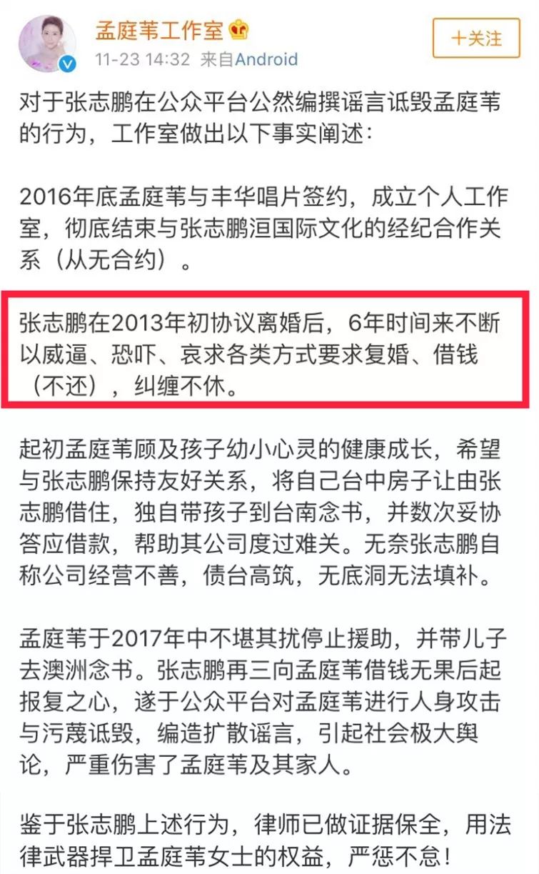 23日,孟庭苇工作室针对张志鹏的长文,发布声明,称张志鹏在2013年初协议离婚后,6年时间来不断以威逼、恐吓、哀求各类方式要求复婚、借钱(不还),纠缠不休。