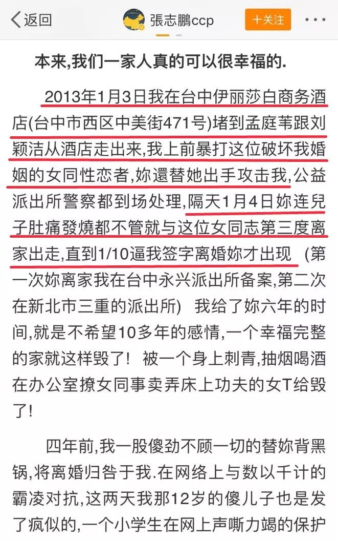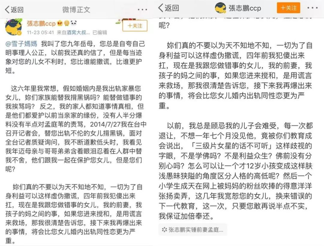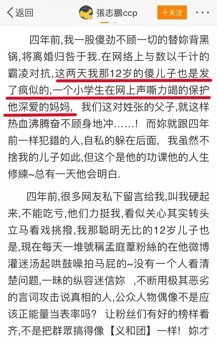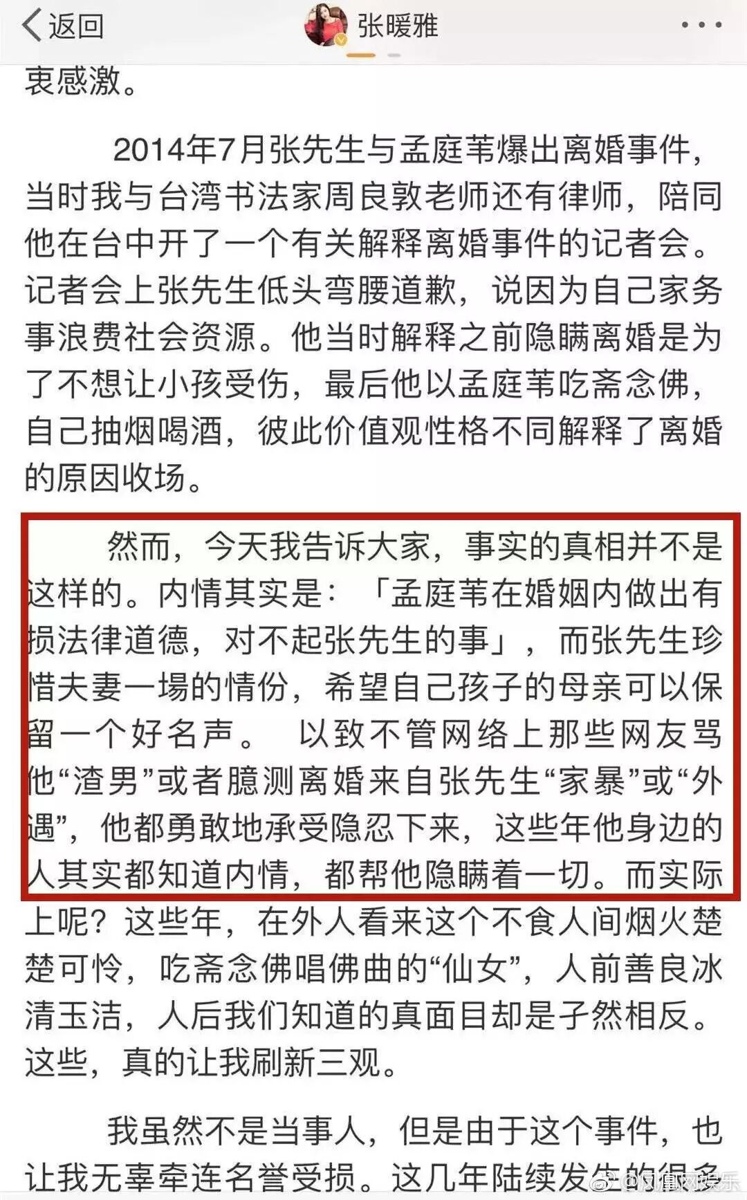 本来一切都是好好的,没想到,23日凌晨,孟庭苇前夫张志鹏也突然发力,在微博发长文,以“一场拖了六年的歹战”为题,回应了张暖雅的爆料。