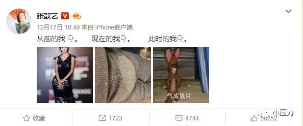 12月17日,张歆艺在微博上晒出了自己怀孕前后的对比照片,还嘲笑自己的孕肚是:接食物残渣专用。