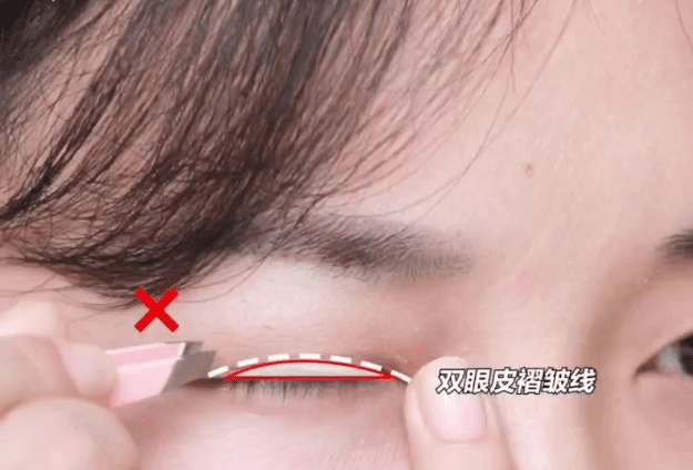 Tips2:贴的位置不能低于双眼皮褶皱线,不然睁眼时会很明显、不自然。要压在褶皱线上,双眼皮的弧度会撑起一个新的褶皱线,这样双眼皮才会露出来哦。