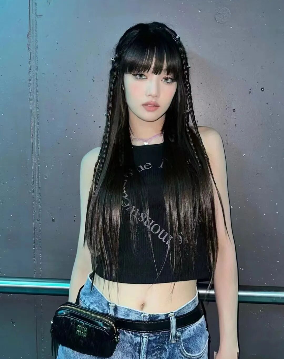 因为少了眼皮褶皱线,单眼皮的眼睛看上去会更加窄长。如果眼距较宽,就会自带一种疏离感。可以像金米妮和单依纯和金米妮一样,强调面部平整度,通过加重眼线和眼睑下至来塑造厌世感妆容。