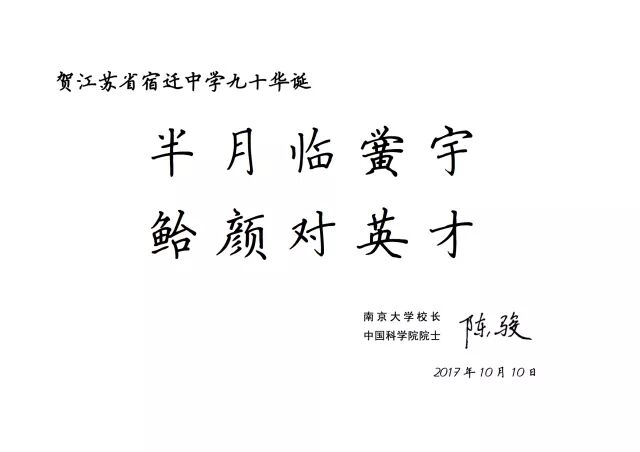 作为宿迁中学2016届毕业生,在母校90周年华诞之际,我想向母校致以最诚挚的祝福:光辉历程更辉煌,人才辈出代代强,桃李满天扬四海,硕果累累振华夏!