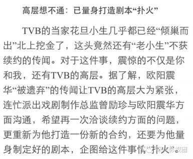 不算欧阳震华,这些年离巢北上的艺人包括但不限于:罗嘉良、郭晋安、陶大宇、张智霖、林峰、刘恺威、郑嘉颖、佘诗曼、黎姿、陈浩民、蔡少芬、邓萃雯、陈键锋……有的是签部头约,有的是解约,有的正准备合约到期后彻底离开