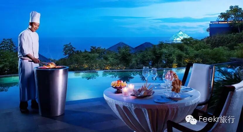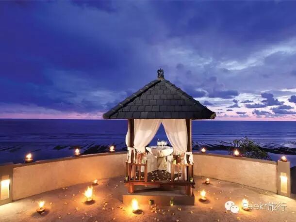 度假村内另外还有两处幽僻的进餐场所,独家提供无与伦比的用餐环境。捆缚式用餐凉亭高耸在令人惊心动魄的悬崖之上,这里就是为你独家提供的用餐地点,下面就是印度洋日夜拍打着的海浪声,奢华丰盛的大餐将在星光闪耀的夜空下为相爱的你们呈现!