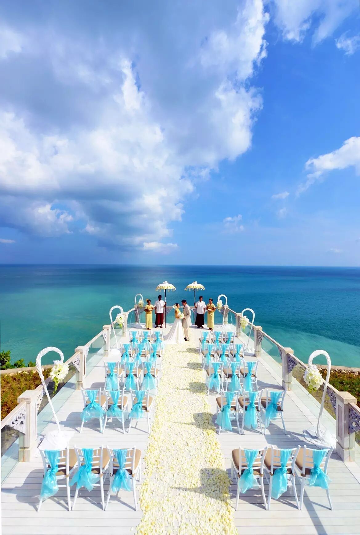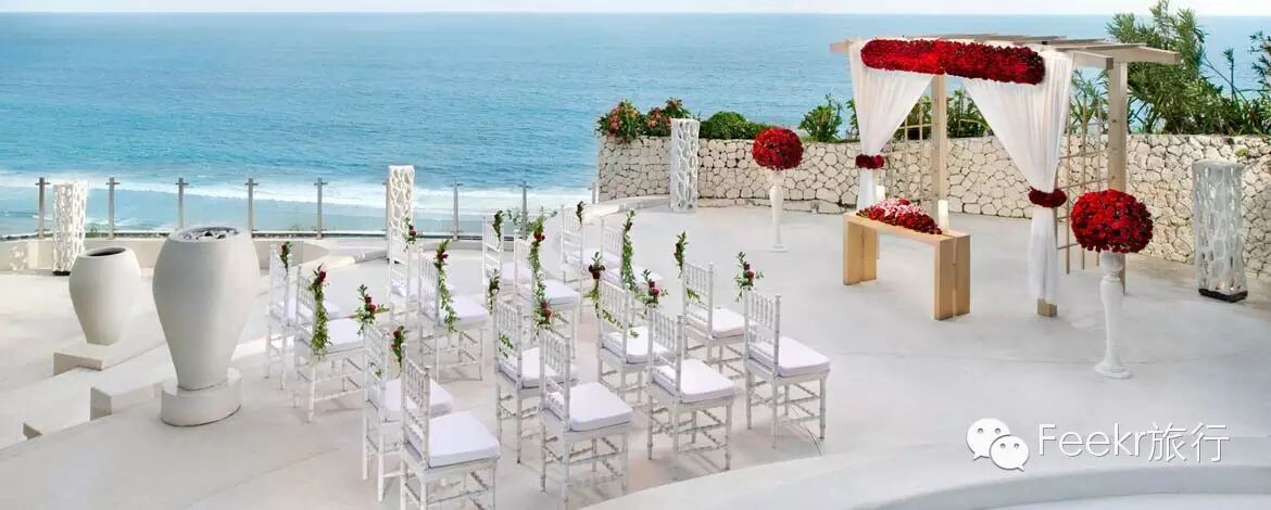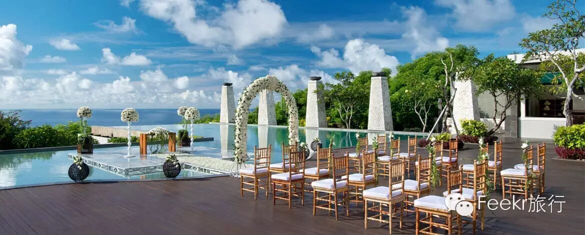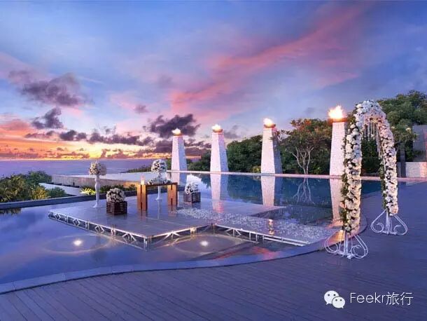阿雅娜的SKY婚礼场地是巴厘岛为数不多可以容纳百人宾客的婚礼场地,同样,此场地目前是巴厘岛最贵的婚礼场地,坐拥180度的海洋和日落美景,在这里举行婚礼,情侣们宛如悬浮在印度洋之上35米的高空里,将海天一线的如画美景尽收眼底。入口阶梯和多层次喷泉如瀑布一般跌进从悬崖上延伸出的3.5米长的悬臂式平台。