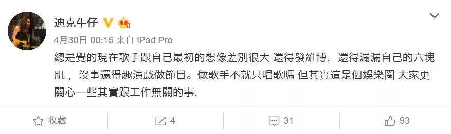 可滚君就是打心底佩服如此“傻”的迪克牛仔,敢于直言不讳、怒怼混乱的娱乐圈、有自己的底线,但也深深为他担心。