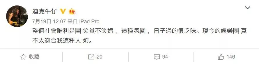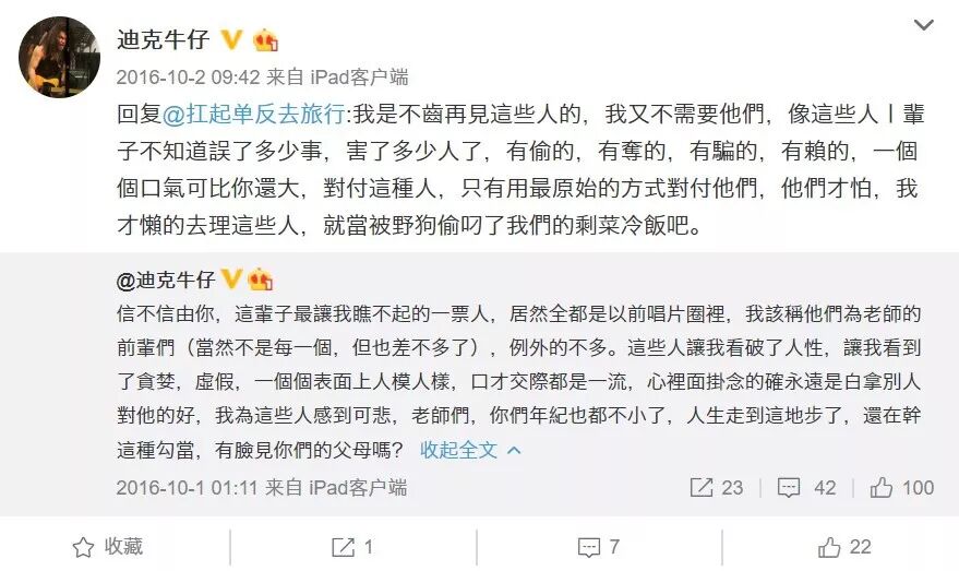 更别说已经60岁高龄的迪克牛仔,还总在微博上抨击着娱乐圈那些丑陋的现象,一会儿怼不务正业的歌手,一会儿痛骂那些唱片圈德高望重的大佬,把他们比作野狗。