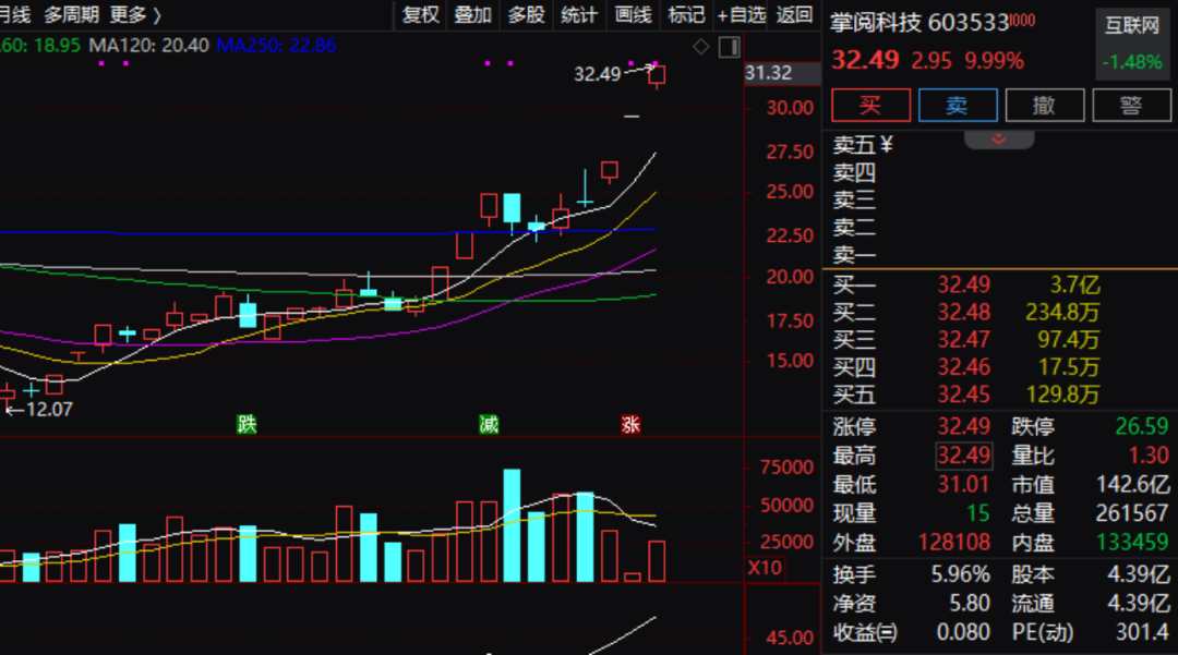 掌阅科技盘中再度涨停,这是该股连续第三个交易日涨停。