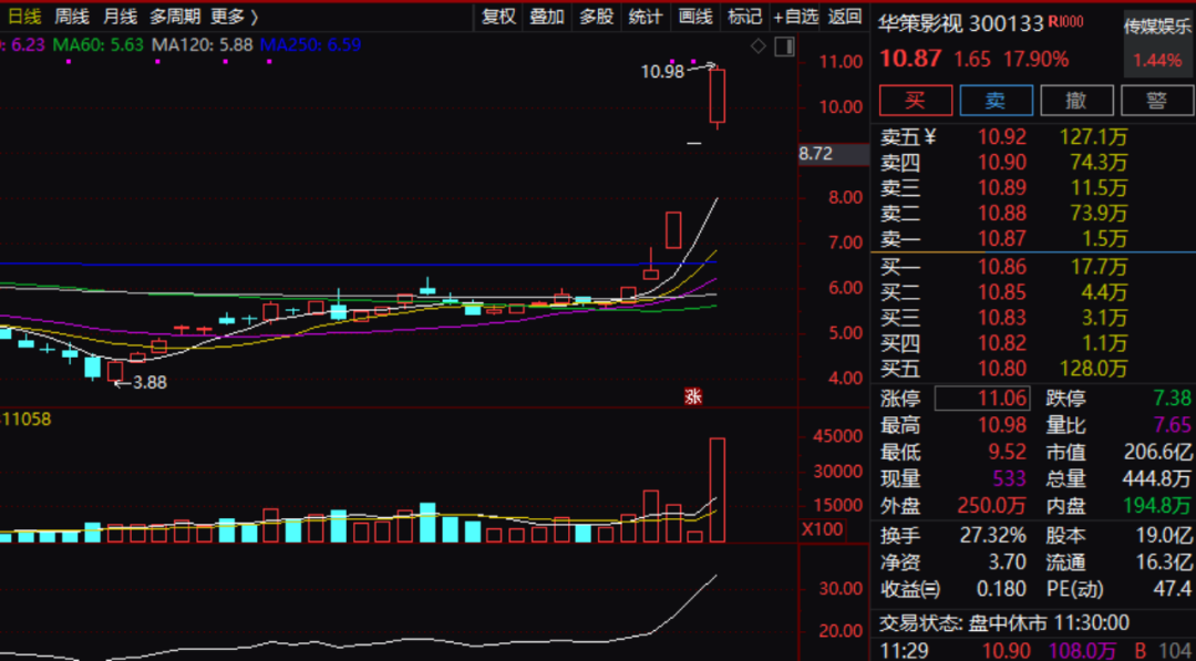 华策影视大幅上涨,盘中涨幅一度超过19%,此前两个交易日华策影视连续“20cm"涨停。