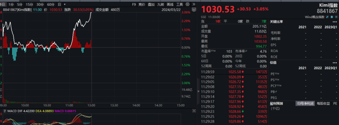 今天上午A股市场整体下跌,截至上午收盘,上证指数下跌1.41%,深证成指下跌1.71%。多个赛道和板块下挫。Kimi概念再度成为市场最大亮点,盘中大幅冲高,多只概念股继续大涨。