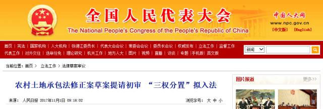 全国人大农业与农村委员会副主任委员刘振伟表示,“‘三权分置’是继家庭联产承包责任制后农村改革的又一重大制度创新。” 目前,农村已有30%以上的承包农户在流转承包地,流转面积4.79亿亩。