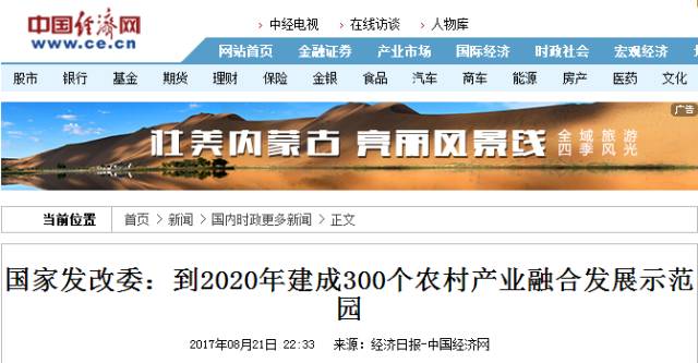 国家发改委:到2020年建成300个农村产业融合发展示范园