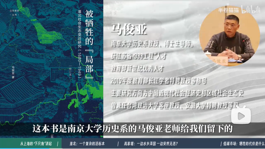 说起淮北,我们不得不提起一本书,这是一本历史地理著作,《被牺牲的局部:淮北社会生态变迁研究,1680~1949.》他是南京大学历史系的马俊亚老师,给我们留下的一份非常珍贵的历史文献。在这里他给我们举了这样一个例子,一个地方社会在中央政府基于政治权力的实际运作之下,是怎么从一个鱼米之乡变成了个穷乡僻壤的地方。而封建王朝之中,所谓顾全大局思维制定下的政策又会对一个地方的政治经济和文化发展产生怎么样的影响?
