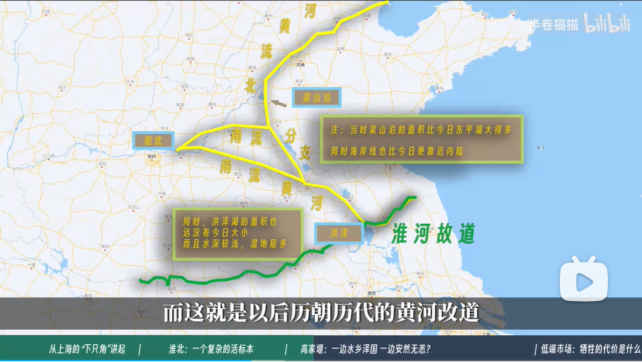 决口之后的黄河在梁山坡分成了南北两支,南边这一道直接灌入了淮河,而这就是以后历朝历代的黄河改道这样一个重大灾难的源头,史称黄河夺淮。因为黄河的水比淮河的水的水位是要高的,于是黄河的水进入了淮河之后,他就把淮河的河道彻底地充盈了。而这一段淮河的流速会放低,流量会增加,水位会抬高。甚至会倒流。最终大家在地图上看到的这一片大小胡哨的洼地连成了一片,汇聚了这么一个沼泽一样的湖泊。