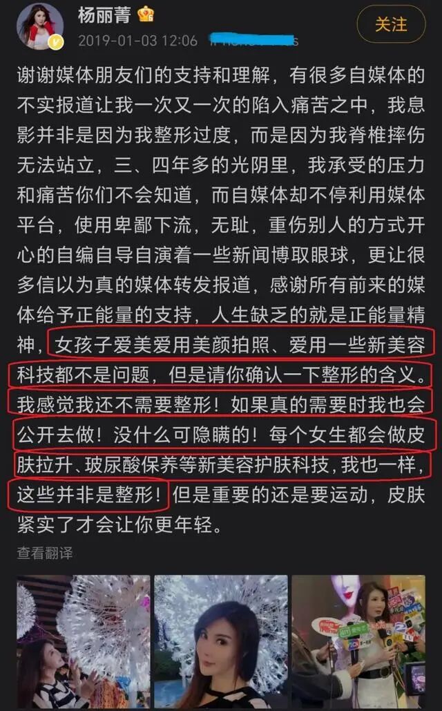 2019年,杨丽菁曾发文否认息影是因为整容失败,再次否认整过容,还给大家科普了整形跟美容的区别。