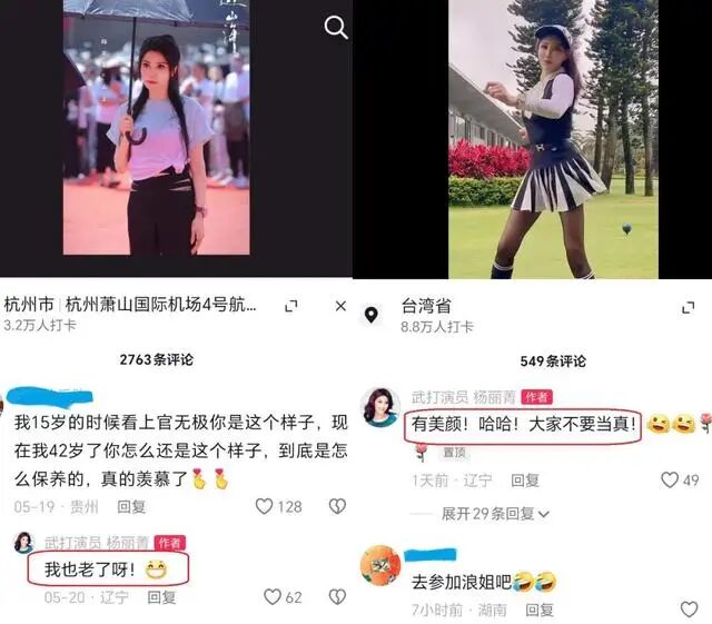 即便在社交平台上发十级美颜过的视频的杨丽菁,似乎没有自欺欺人的意思,面对网友们对她颜值的称赞,她有时提醒“有美颜,大家不要当真”、“我也老了呀!”