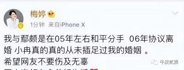 而此时梅婷站起来发声了,她在微博上写到:我与鄢颇是05年和平分手,06年协议离婚的,小冉从来没有插足过我的婚姻。