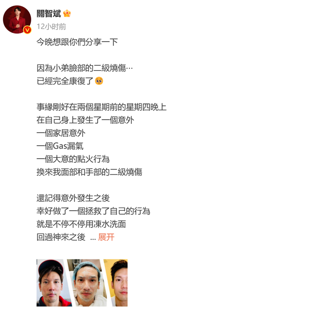 12月1日晚,香港男星关智斌在个人社交账号上发文,分享自己二级烧伤的经历。