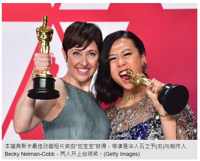今年四名入围的华裔电影人有两人获奖,其中迪士尼(Disney)皮克斯动画工作室(Pixar Animation Studios)首次采用女导演执导的动画短片“包宝宝”,是以中国美食为主题,事实上是导演石之予记录了她与母亲之间的关系;石之予形容这部片为“华人版的姜饼人故事”,她和监制贝基内曼(Becky Neiman-Cobb)上台致词时,鼓励女孩不要害怕诉说自己的故事。