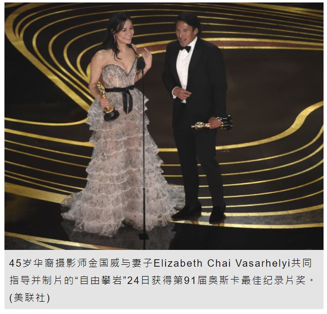 45岁华裔摄影师金国威与妻子伊丽莎白瓦沙瑞莉(Elizabeth Chai Vasarhelyi)共同编导的“自由攀岩”获得最佳纪录片奖,此片跟随攀岩爱好者艾力克斯霍诺德(Alex Honnold),记录他徒手攀登上优胜美地国家公园(Yosemite National Park)3000呎酋长岩(El Capitan)壮举;扣人心弦的剧情及高难度拍摄技巧,此前该片已获英国影艺学院最佳纪录片奖,如今众望所归再拿下小金人。