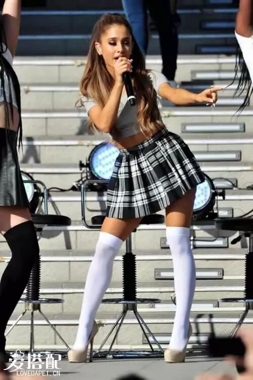 Ariana Grande喜欢学生气的学院风搭配,因为她对格子短裙非常的钟爱。经常穿着格子短裙搭配中性色的上衣,非常的具有学院风的气质。