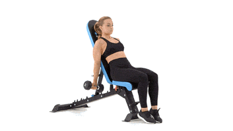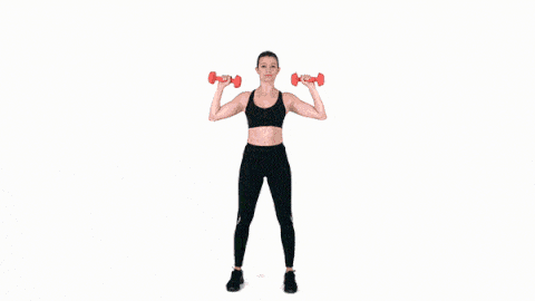 做法:双手各握哑铃,手掌朝内,手臂伸直向下;脚后跟踩到地面,稍微弯曲膝盖,支撑核心;屈手肘将哑铃举向肩膀,向上移动时旋转手臂,使手掌朝上;举重时呼气,降低时吸气;重复12次。