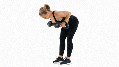 做法:站立,双脚分开约臀宽,双手分别握住重量,屈髋向前向下折叠,臀部向后推;稍微弯曲膝盖,背部要保持平坦,然后将手臂拉向胸部,肘部靠近身体两侧,在动作的最高点,将肩胛骨挤在一起;重复练习10-13次。
