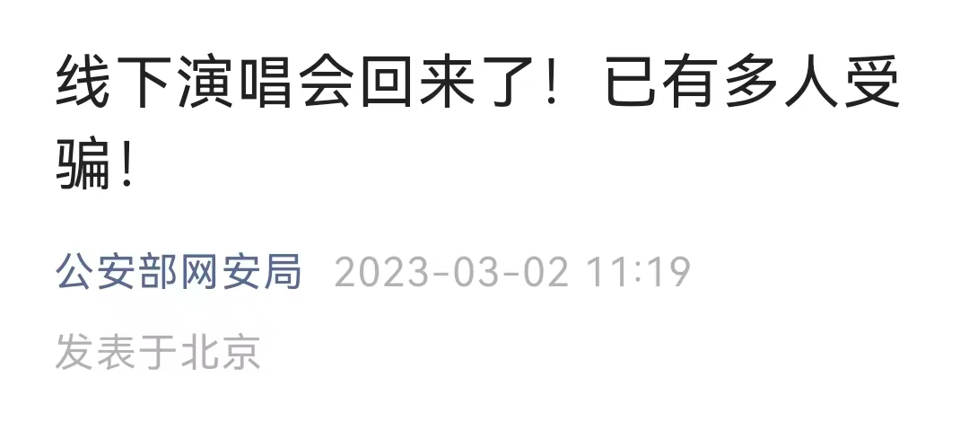 在演唱会官方门票开售前夕,骗子到处宣称有官方的售票渠道,或者是内部人员,可以买到非常紧俏的门票,吸引粉丝上钩。