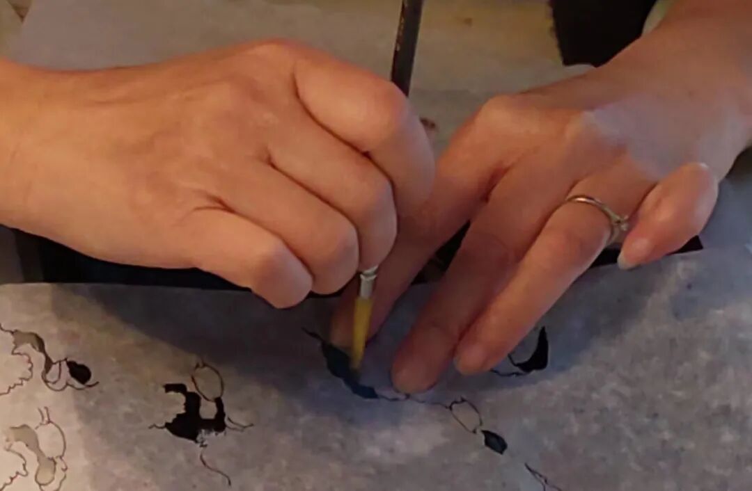 在我们要求下,陈冰在一幅未完成的作品上示范起无勾勒晕金技法,提笔晕染时,上一秒还是嘻嘻哈哈的她下一秒立刻不苟言笑,那专注的神态真是让人不忍打扰。陈冰告诉我们,晕金需要十二分的耐心,一点点晕染,有时候一天只能晕出一片花瓣。而且为了少出错,她在工作台前一坐就是一整天,忘却所有。