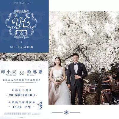 婚礼当天,在印小天婚礼请柬封面上印有印小天与妻子哈琳娜的姓名开头字母缩写YH以及结婚日期。请柬背面附文“邀你走入纯洁如冰雪的爱情世界”,请柬以冰雪为主题。