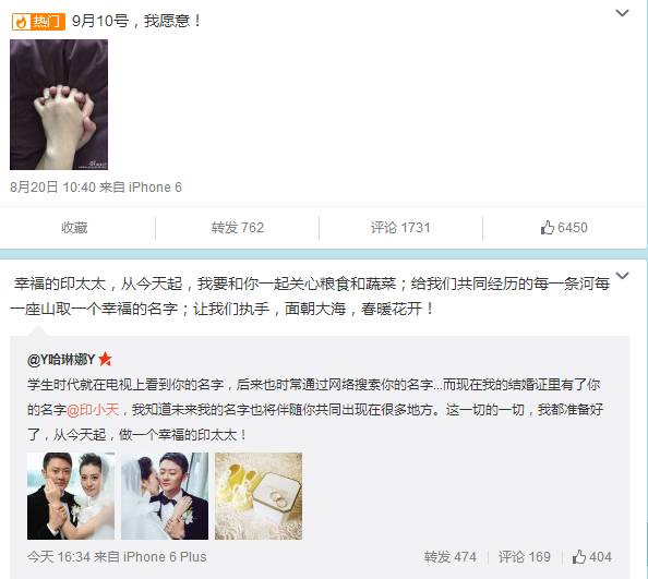 9月10日,印小天与哈琳娜于北京举行婚礼,导演赵宝刚作为主婚人出席,曹云金、朱雨辰、吴越、张睿、何刚5人组成型男伴郎团。另外,由张国强、于娜 、陶虹、涂松岩 、郭晓冬、杨威等组成好友团出席。