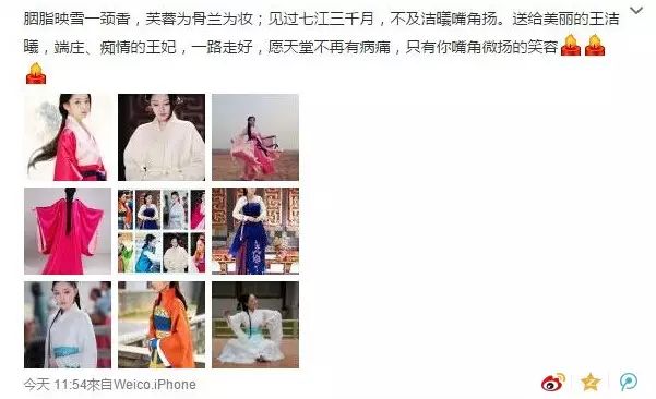 还未开播的电视剧《兰陵王妃》官方微博也发声悼念这位痴情的女演员:“胭脂映雪一颈香,芙蓉为骨兰为妆;见过七江三千月,不及洁 嘴角扬。送给美丽的王洁曦,端庄、痴情的王妃,一路走好,愿天堂不再有病痛,只有你嘴角微扬的笑容”。