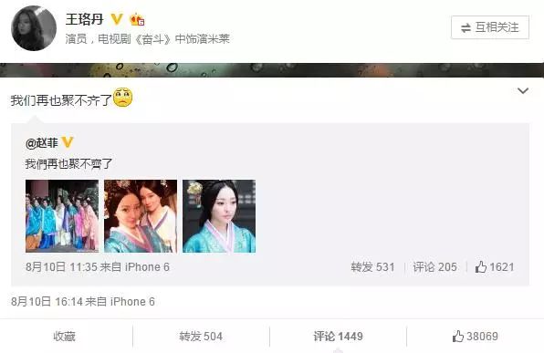 演员王珞丹也转发昔日与王洁曦的合影,写道:“我们再也聚不齐了。”并配有伤心的表情,表达对王洁曦的思念之情。