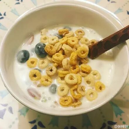 有时会用无糖的自制酸奶拌上蓝莓、各种果仁及少量麦圈,也可以淋一点蜂蜜调味。”