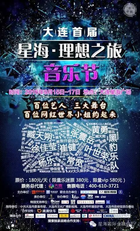 9月15日至17日,大连首届星海•理想之旅音乐节将在大连星海广场拉开大幕。据悉这次音乐节主办方将诚邀百组艺人现场开唱互动,百余网红现场直播,玩转多元素混搭,打造一场万人相约盛大派对。